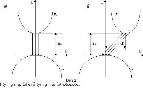 Оптическим переходам с сохранением квазиимпульса соответствуют вертикальные в k-пространстве (прямые) переходы. Сохранение квазиимпульса в процессе излучательного перехода может рассматриватся как квантомеханическое правило отбора (в том случае, когда в акте излучательной рекомбинации не принимают участие третьи частицы, например, фононы или атомы примесей).Невертикальные в k-пространстве (непрямые) переходы имеют значительно меньшую вероятность по сравнению с прямыми переходами, так как в этом случая требуется сбалансировать некоторый разностный квазиимпульс dk (рис. 2).