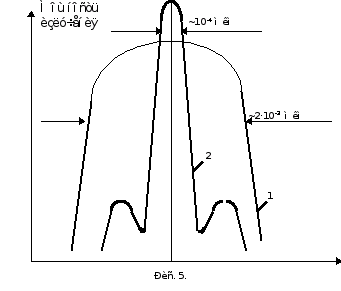 Лазерный диод не сразу начинает излучать при приложении к нему напряжения от внешнего источника. При малом токе имеет место спонтанное излучение (рис. 5) с шириной спектра излучения в несколько сот микрометра. По мере нарастания тока накачки в области p—n-перехода создается высокая степень инверсии населенности и излучается больше света. Отдельные фотоны многократно проходят строго в плоскости p—n-перехода и перпендикулярно к торцам диода усиливаются. С возрастанием тока накачки испускаемое диодом излучение существенно сужается одновременно по ширине спектра и по пространственной расходимости. Когда возникает индуцированное излучение, интенсивность излучения увеличивается за счет образования большого количества электронно-дырочных пар в единицу времени. Спонтанное излучение подавляется вследствие того, что образовавшиеся первоначально фотоны повторяют себя при прохождении через активную область. Излучение лазерного диода, полученное при плотностях тока выше порогового, являются когерентными. При этом форма кривой спектрального распределения резко изменяется от широкой кривой распределения спонтанной эмиссии 1 к кривой с несколькими узкими модами 2 (рис. 5).