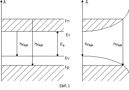 Рассмотрим собственный полупроводник. В условиях термодинамического равновесия валентная зона полупроводника полностью заполнена электронами, а зона проводимости пуста. Предположим, что на полупроводник падает поток квантов электромагнитного излучения, энергия которых превышает ширину запрещенной зоны hv>Eg. Падающее излучение поглощается в веществе, так как образуются электронно-дырочные пары. Одновременно с процессом образования электронно-дырочных пар протекает процесс их рекомбинации, сопровождающийся образованием кванта электромагнитного излучения. Согласно правилу Стокса - Люммля энергия излученного кванта меньше по сравнению с энергией генерирующего кванта. Разница между этими энергиями преобразуется в энергию колебательного движения атомов кристаллической решетки. В условиях термодинамического равновесия вероятность перехода с поглощением фотона (валентная зона - зона проводимости) равна вероятности излучательного перехода (зона проводимости - валентная зона).