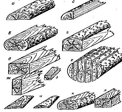 Виды пиломатериалов (рис 2): пластина (рис 2-а), четвертина (рис 2-б), двухкантный брус (рис 2-в), трехкантный брус (рис 2-г), четырехкантный брус (рис 2-д), необрезные доски (рис 2-е), обрезная доска ( рис 2-ж), бруски (рис 2 -з), обапол (рис 2-и), шпалы (рис 2-к,л).
