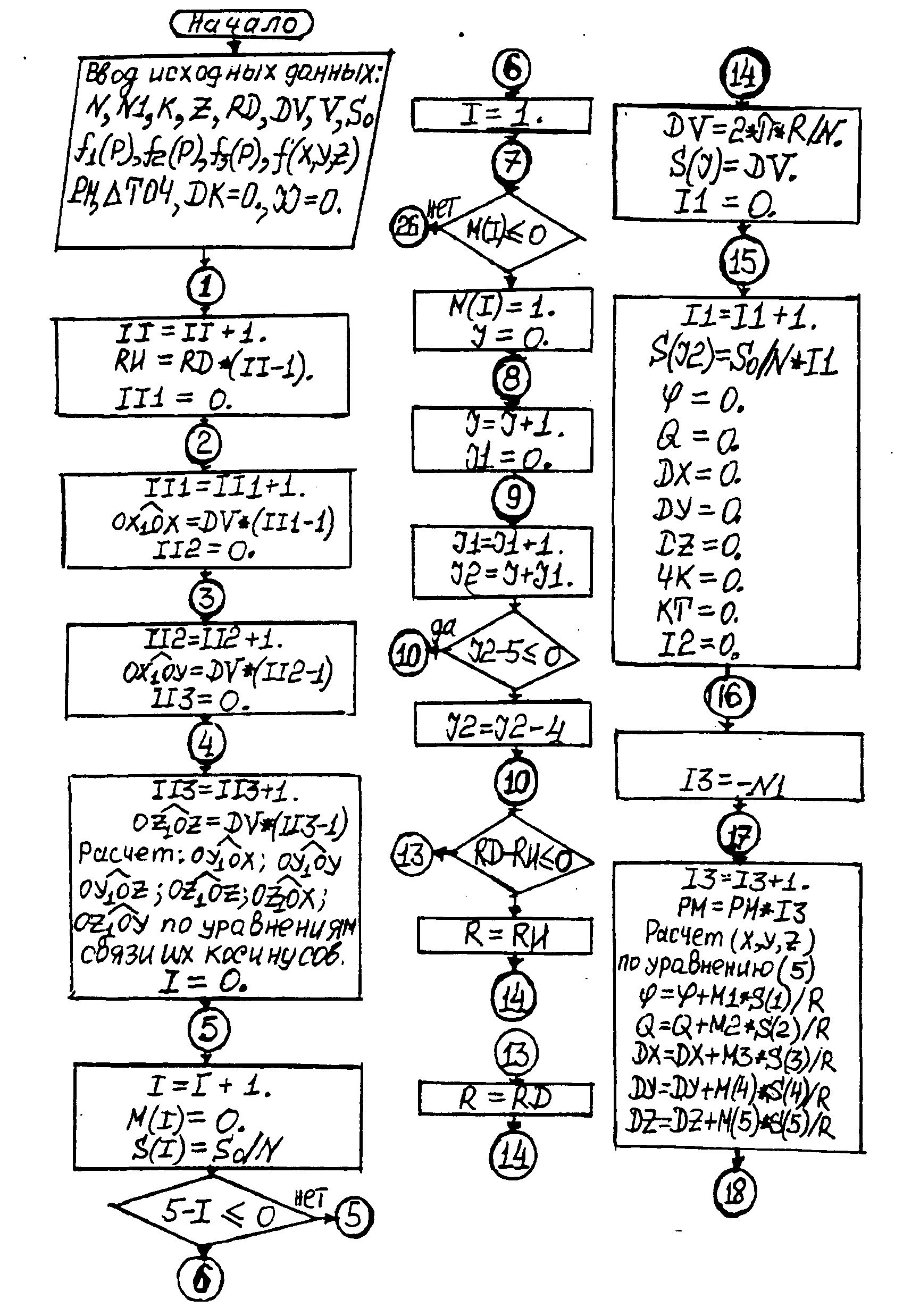 Таким образом, по уравнению (5) можно рассчитать координаты (ХоYoZо) точек поверхности или семейства поверхностей резания, относящиеся к исходной пространственной системе детали, в которой определенным образом ориентирована деталь и задана геометрически произвольная, формируемая поверхность. При расчете координат точек поверхностей резания на ЭВМ очевидна возможность определения множества точек, принадлежащих формируемой поверхности детали, простой проверкой условия удовлетворения рассчитываемых координат алгебраическому или натуральному уравнению поверхности детали, заданной произвольно в той же системе. Выполнение этого условия дважды будет означать двукратное касания линией режущей кромки теоретически заданной, формируемой поверхности детали. Так как движение кромки осуществляется от исходного контактного положения по траектории резания, то двойное выполнение упомянутого условия за полный цикл формообразования определит возможный способ механической обработки. Количество кинематических вариантов формообразования заданной поверхности выбранной линией режущей кромки предполагаемого инструмента будет зависеть от: