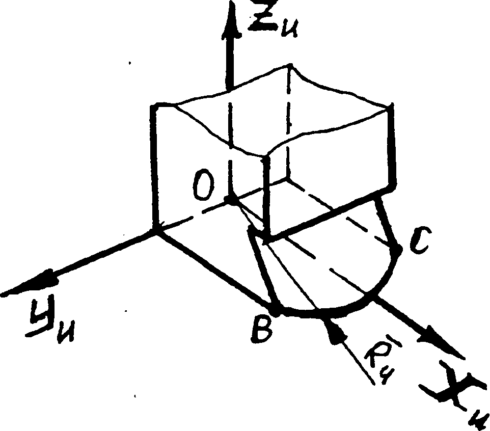 Общей схемой предусмотрсно вращение инструмента относительно лишь одной оси, но если учесть, что система инструмента может быть расположена в пространстве как угодно, (принимаемые значения пространственных углов), то тем самым и можно считать заданным существование третьего движения вращения всей системы инструмента вокруг системы детали с центром вращения в контактной точке О, определяемое изменением значения одного из углов.