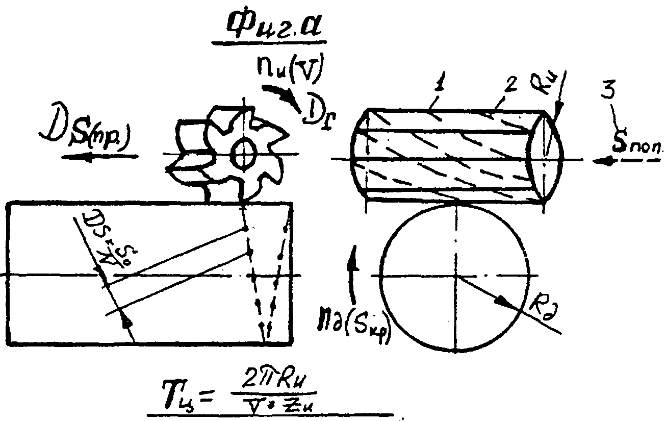 Наиболее сложные случаи трансформации схемы формообразования в способ механической обработки возникают при выводе на печать условий определяющих движение со скоростью, резания как результирующей, являющейся производной от двух выполняемых движений. Например: режущая кромка задана в виде винтовой линии с углом подъема от оси вращения лу=60° -произвольная величина. На печать выводится как самая производительная схема формообразования, эвольвентной поверхности прямозубого колеса схема содержащая три движения А=/0, Б=/0; Р=0. При их выполнении на скрещивающихся осях, когда угол поворота B=w, винта кромки инструмента. При этом скорость резания V=f(А и Б). В этом случае возникает несколько решений при трансформации схемы в способ формообразования. Чтобы избежать их требуется проанализировать процесс формообразования эвольвентной поверхности прямозубого колеса при задании линии кромки инструмента точкой и затем его кромки в виде окружности радиуса Ru.