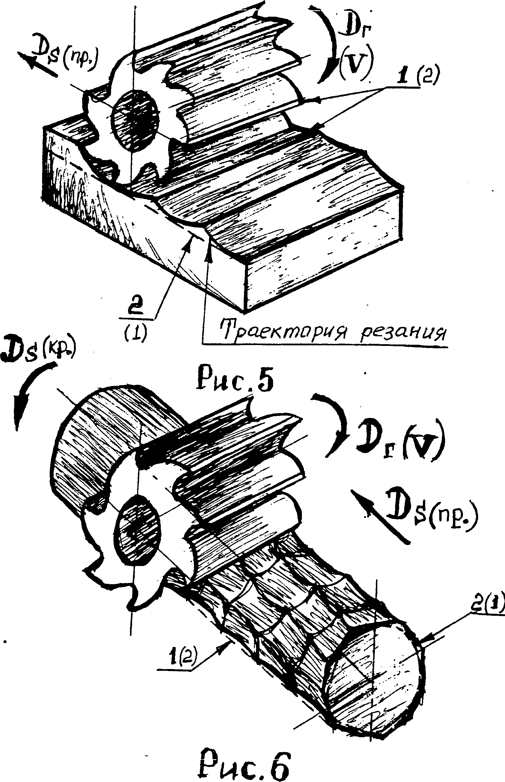 Этот метод состоит в том, что образующая линия 1 является проекцией (следом) траектории движения точки (вершины) режущей кромки инструмента или траектории результирующего движения резания на плоскость вектора Ds(пр), а направляющая линия 2 проекцией (следом) этой же траектории на плоскости вектора Dг (рис 4). Оба движения резания формообразующие.