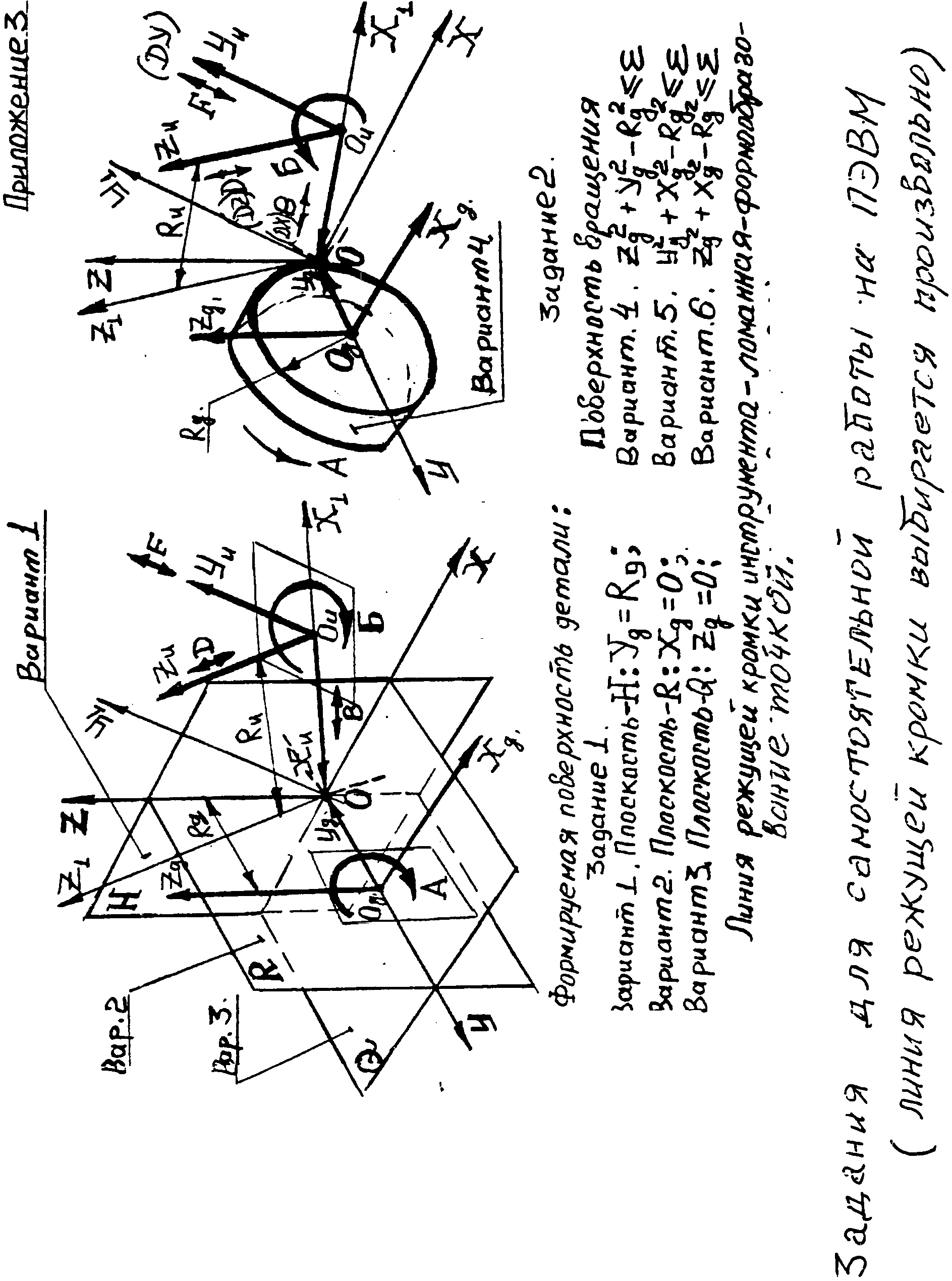 Таким образом, трансформация схемы формообразования определенной на ЭВМ как наиболее эффективная весьма проста. Поскольку печать ЭВМ конкретизирует движения, выполняемые в процессе формообразования, устанавливает равенство или неравенство нулю Ru=0 (Ru=/0). Определяет форму режущей кромки инструмента как линии и только в случае режущей кромки как пересечение двух линий (резец с углами в плане) представляет ее точкой. Поскольку трансформация информации полученной с ЭВМ в способ является простым изображением процесса как схемы резания со словесной констатацией типа инструмента, к которым следует отнести: