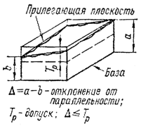 Под отклонением от параллельности плоскостей понимают разность наибольшего и наименьшего расстояний между прилегающими плоскостями в пределах нормируемого участка.