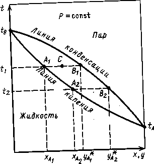 Как отмечалось, достаточно высокая степень разделения однородных жидких смесей на компоненты может быть достигнута путем ректификации. Сущность процессов, из которых складывается ректификация, и получаемые при этом результаты можно проследить с помощью t — х — у -диаграммы (рис. 1.1).
