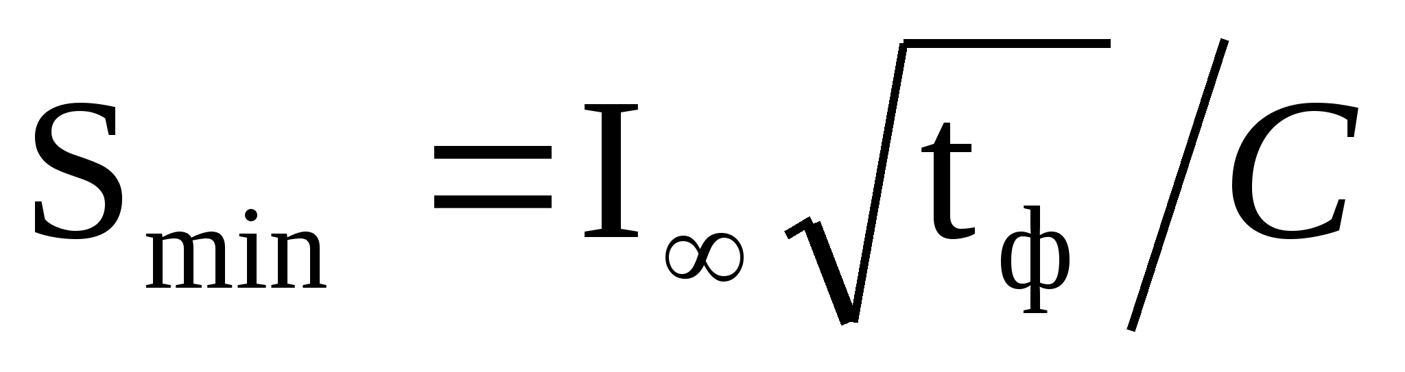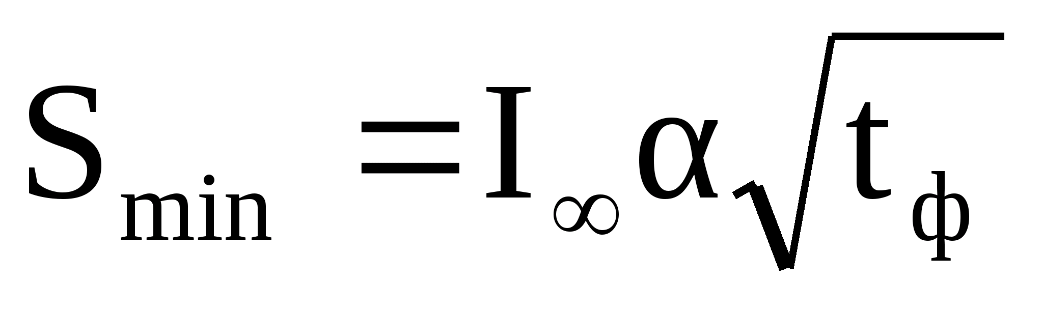где I∞ - установившийся ток к.з., α – термический коэффициент для кабелей напряжением до 10 кВ с медными жилами α=7, с алюминиевыми жилами α=12; С – коэффициент (при напряжении до 10 кВ включительно) для меди С=165, для алюминия С=90, ля стали С=60÷70; t>ф> – время прохождения тока к.з. (принимается равным времени действия защитного реле плюс собственное время отключения силового выключателя), с; S>min> – минимально допустимое сечение токоведущей жилы кабеля по условию нагрева токами к.з., мм2.