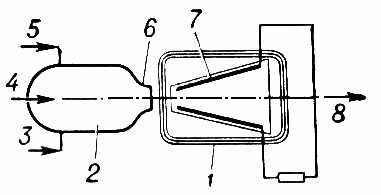 М. г. состоит из канала 8, по которому движется рабочее тело 4 (обычно плазма), электромагнитной системы для создания магнитного поля 1 и устройств для отвода электроэнергии (электродов) с включенной нагрузкой 7 (рис. 1).