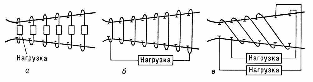 По способу отвода электроэнергии М. г. разделяют на кондукционные и индукционные. В кондукционных М г. в рабочем теле, протекающем через поперечное магнитное поле, возникает электрический ток, который через съёмные электроды, вмонтированные в боковые стенки канала, замыкается на внешнюю цепь. В зависимости от изменения магнитного поля или скорости движения рабочего тела такой М. г. может генерировать постоянный, как правило, или пульсирующий ток. В индукционных М. г. (по аналогии с обычными электромашинными генераторами) электроды отсутствуют. Такие установки генерируют только переменный ток и требуют создания бегущего вдоль канала магнитного поля. Возможны различные формы каналов: линейная - общая для кондукционных и индукционных М. г.; дисковая и коаксиальная холловская - в кондукционных; радиальная - в индукционных М. г. По системам соединений электродов различают: фарадеевский генератор со сплошными или секционированными электродами (рис. 2, а), холловский генератор (рис. 2, б), в котором расположенные друг против друга электроды короткозамкнуты, а напряжение снимается вдоль канала за счёт наличия поля Холла, и сериесный генератор с диагональным соединением электродов (рис. 2, в).