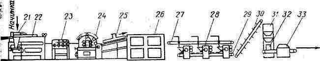 Выходящий из карамелеобкаточной машины карамельный жгут с начинкой внутри проходит через жгутовытягивающую машину 23, которая калибрует его до нужного диаметра. Откалиброванный карамельный жгут непрерывно поступает в карамелеформующую машину 24, которая формует его на изделия с рисунком на поверхности. Отформованная карамель непрерывной цепочкой поступает на узкий ленточный охлаждающий транспортер 25, на котором происходит охлаждение перемычек между изделиями и предварительное охлаждение самой карамели. Этим же транспортером карамель в виде цепочки подается в охлаждающий шкаф 26, где она разбивается на отдельные изделия и охлаждается. Охлажденная карамель из шкафа поступает на распределительный конвейер 27, вдоль которого установлены карамелезаверточные автоматы 28. Под распределительным конвейером расположен ленточный транспортер 29, на который поступает завернутая карамель со всех машин. Завернутая карамель промежуточным транспортером 30 подается на весы 31, взвешивается и упаковывается в картонные ящики 32, которые затем закрывают и оклеивают бандеролью на специальной машине 33.