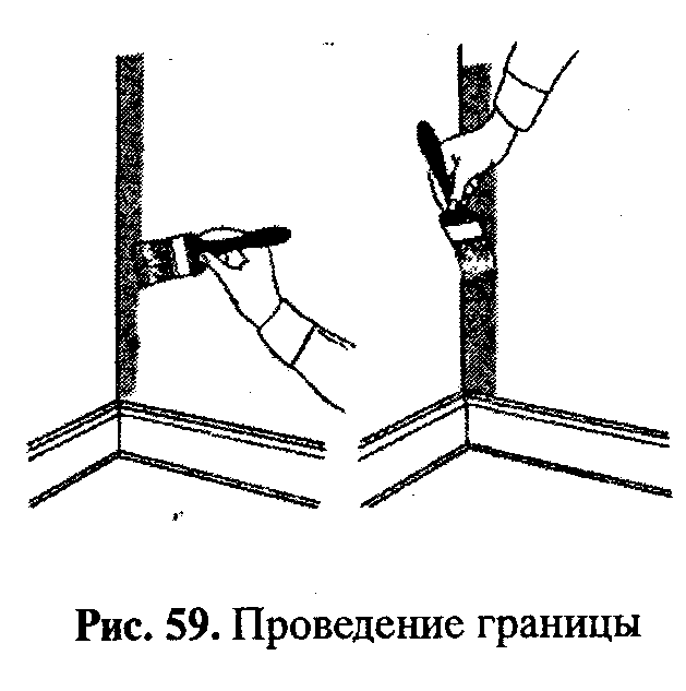 В начале работы необходимо провести кистью границу (даже если вы всю поверхность красите валиком) – закрасьте полосу около 50 мм шириной в углу между соединяющимися поверхностями (рис. 59).