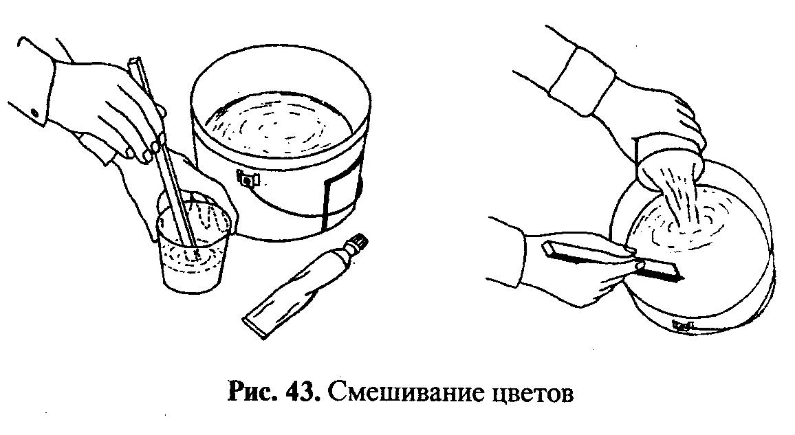 Если вы решили поэкспериментировать, смешивая краски для получения нового тона, или подобрать старый, возьмите концентрированную краску – «Универсальное красящее вещество», выпускаемую в разных цветах и подходящую для всех типов краски. Но не выливайте это вещество прямо в банку с краской, так как малейшая ошибочка может испортить всю порцию. Перелейте немного краски в прозрачную пластиковую или стеклянную кружку (см. рис. 43). Верную пропорцию выбирайте, согласовываясь с инструкцией на этикетке. Через прозрачные стенки кружки вы сможете увидеть, не осталось ли где несмешанной краски. Тщательно перемешивайте цвета в кружке и начинайте выливать краску из неё банку, постоянно помешивая, пока не добьётесь желаемого цвета.