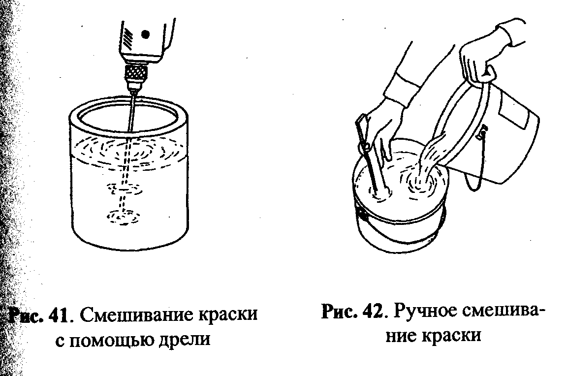 Краску можно смешать и вручную (рис. 42). Слейте примерно треть жидкой краски из верхней части банки во вторую ёмкость. Перемешайте оставшуюся краску до однородного состояния деревянной лопаткой. Металлическую ложку или проволоку брать не рекомендуется, так как внутренняя часть банки может иметь предотвращающее ржавление покрытие, которое вы можете повредить. Добавляйте жидкую краску, отлитую в ёмкость, постепенно, маленькими пропорциями, постоянно перемешивая, пока не вольёте всю краску. Несколько раз перелейте краску из банки в ёмкость и обратно, чтобы она хорошо смешалась.