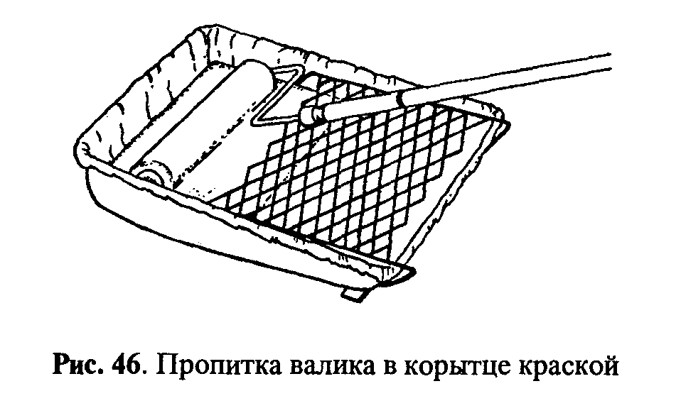Возьмите специальное корытце для валика и выстелите его толстой алюминиевой фольгой. Налейте краску к корытце примерно наполовину и погрузите туда валик (рис. 46).