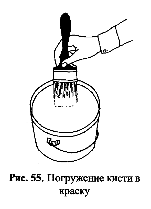 Итак, всё готово для начала работы. Опустите щетину кисти в краску на 1/2-1/3 её длины (рис. 55). Затем слегка постучите муфтой о бортик ёмкости, чтобы стряхнуть лишнюю краску. Не вытирайте кисть о бортик – так удаляется слишком много краски. Не следует также погружать кисть слишком глубоко в краску. В этом случае лишняя краска будет капать или стекать по рукоятке. Если же краска засохнет внутри муфты, кисть будет испорчена.