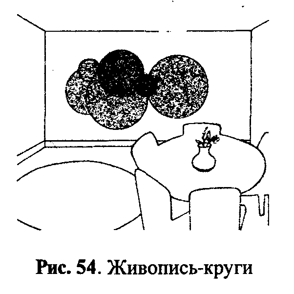 Можно использовать стенную живопись, чтобы оживить комнату, например как показано на рис. 54. Чтобы не рисовать по влажной краске, начните с обеих сторон после нанесения рисунка мелом с помощью решётки на стену. Наклейте по контуру первого круга и покройте его краской с помощью муштабеля. Удалите ленту и закрасьте перекрывающиеся круги по рисунку. Цвета такого сложного рисунка, как этот, не должны быть слишком яркими, ибо кричащие тона могут оказывать подавляющее действие, особенно в маленьком помещении.