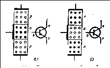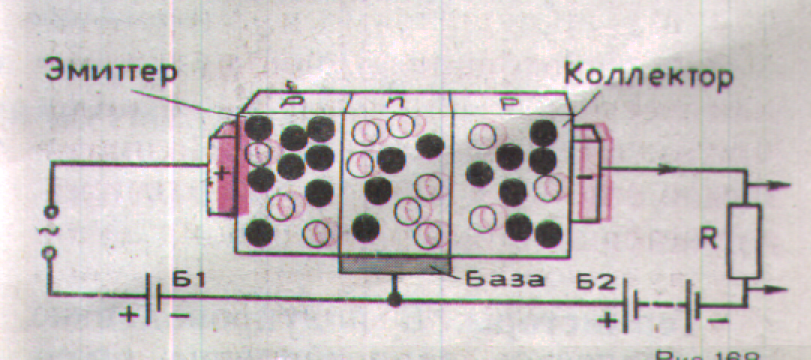 левый р—n переход является прямым и отделяет базу от области с проводимостью р-типа, называемую эмитером. Если бы не было правого р –n -перехода, в цепи эмиттер - база существовал бы ток, зависящий от напряжения источников (батареи Б1 и источника переменного напря-