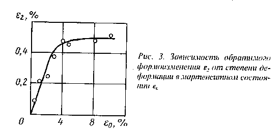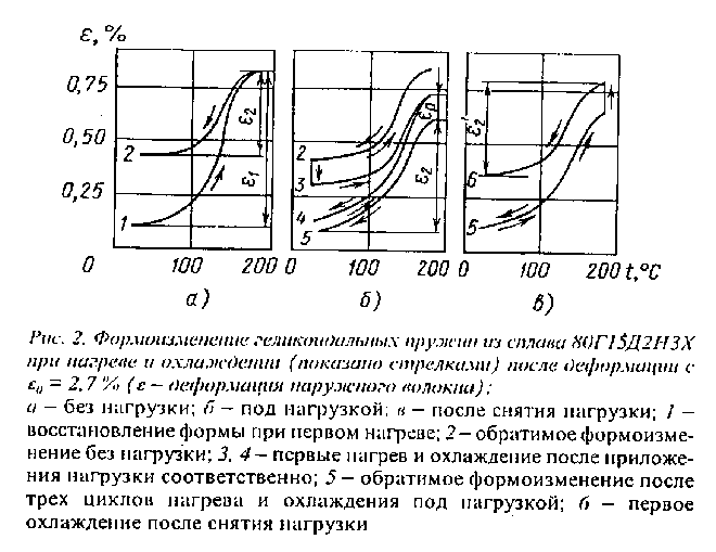 Выводы. 1. Наилучшим способом формирования обратимой памяти в изделиях из сплава 80Г15Д2НЗХ является пластическая деформация в мартенситном состоянии со степенью 5-10 %. Несколько менее эффективным способом является приложение к изделию нагрузки в процессе мартенситного превращения. Совместное воздействие деформации и нагрузки не приводит к существенному повышению степени обратимого формоизменения.
