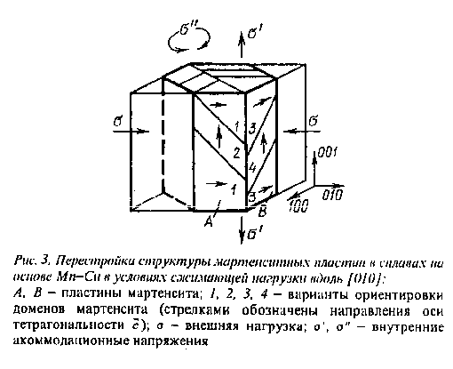 Согласно [б], при ГЦК -» ГЦТ-превращении в Mn-Cu-кристалле образуются пластины мартенсита, граничащие по плоскостям {110}. Каждая из пластин состоит из мартенситных доменов двух вариантов со взаимно перпендикулярными тетрагональными осями с . Домены имеют двойниковую ориентацию с плоскостями двойникования {110}, составляющими угол 60° с границами мартенситных пластин. Границы двойников легко подвижны и при приложении внешних напряжений перемещаются внутрь неблагоприятно ориентированного двойника. Это приводит к формированию мартенситной текстуры с преобладанием доменов с осью вдоль направления сжатия. Однако при неблагоприятной ориентировке мартенситной пластины, для которой направление деформации параллельно плоскости двойникования, перемещение существующих границ двойников невозможно (фактор Шмида равен 0).