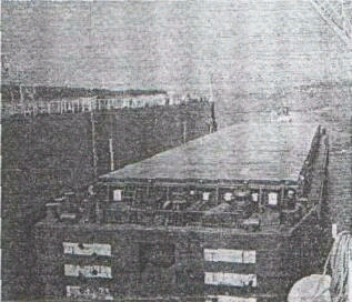 трюма в процессе грузовых операций. Высказывались опасения что в зимних условиях эти трубы вместе с клинкетамн будут замерзать, а оборудование их обогревателями сложно с конструктивной точки зрения. Финские инженеры на основании результатов испытаний в опытовом бассейне сочли целесообразным установить такие трубы, полагая, что трюм будет заполняться водой более равномерно и плавно, а это отразится на времени ведения грузовых операций. На лихтеровозе итальянской постройки подобных труб нет, поскольку авторы проекта убеждены, что поступление воды в трюм можно регулировать степенью открытия кормовой двери и что прочность конструкции лихтеров и лихтеровозов допускает некоторую неравномерность заполнения трюма водой.