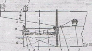 Когда носовая часть лихтера окажется у носовой буксировочной тележки, швартовщик, (находящийся на борту лихтера. набрасывает кольцо швартовно-буксировочного троса на кнехт буксировочной тележки. Свободный конец этого троса закрепляют на лихтере, и за счет перемещения буксировочной тележки вперед он натягивается — носовая часть лихтера пришвартована. После этого с помощью буксира-толкача лихтер передвигается (перемещается и носовая тележка) до такого положения, чтобы кормовая часть его совпала с кормовой буксировочной тележкой. Тем же способом закрепляется кормовая часть фланцы насоса со стороны всасывання и нагнетания соединены с магистральным трубопроводом диаметром 900 мм, от которого в каждый балластный танк (Wбал= 18500 м3) отходят ответвление, снабженное клапаном дистанционного управления. Для повышения ремонтопригодности клапаны расположены в сухих помещениях или в отсеках, смежных с танками, которые обслуживаются данной ветвью. Со стороны всасывания насос соединен с кингстонным колодцем, а со стороны нагнетания — с клапаном бортового отливного отверстия. Пуск насосов к управлению клапанами производятся с постов управления в ЦПУ или в помещении управления грузовыми операциями, расположенном на ходовом мостике, 1.,г также имеются приборы для контроля осадки, крена и дифферента. Балластная система обеспечивает погружение судна по осадку 9,3 м не более чем за 4 ч, а всплытие — не более чем за 3 ч при волнении 1 м.