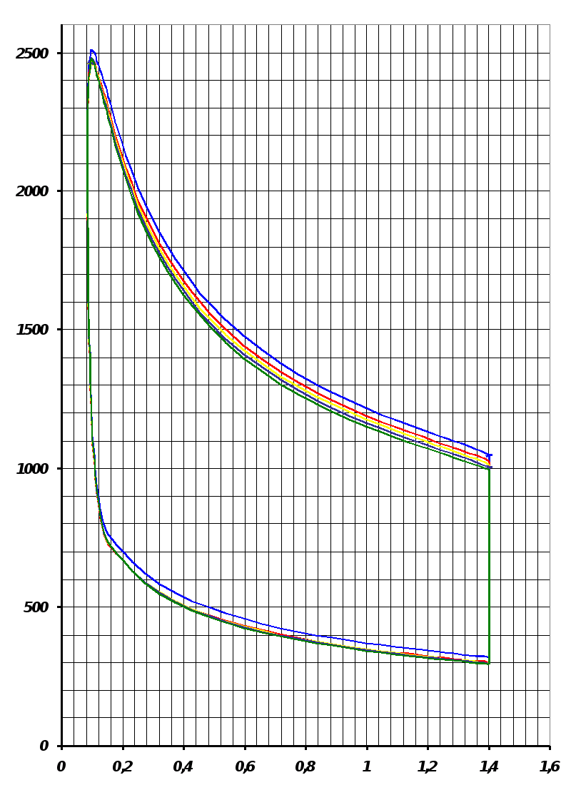2) теплоёмкости рабочего тела принимаются различными для свежего заряда и для продуктов сгорания, но неизменными для процесса сжатия, а также для процессов сгорания-расширения; указанные теплоёмкости выбраны средними в диапазоне температур и состава рабочего тела;