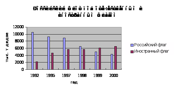 В результате доля судов под иностранными флагами, контролируемых российскими судовладельцами, возросла по дедвейту с 5,2 млн. т в 1996 г. до 6,5 млн. т в 1999 г. и состовляет уже более половины (54%) всего тоннажа России.