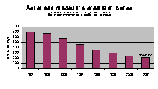 Анализ состояния морского транспорта за последние три года показывает, что флот, контролируемый Россиией, в целом сократился на 27,5%, флот морских пароходств – в 2 раза, флот просих судоходных российских компаний, активно развивавшийся в 1995-1996 гг., также стал сокращаться (в 1999 г. по сравнению с 1996 г. уменьшился в 1,5 раза).