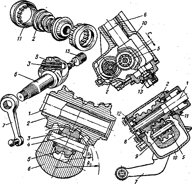 Для поддержания правильного зацепления пары и устранения повышенных зазоров в рулевом механизме, что может вызвать большой свободный ход рулевого колеса, применяют регулировочные устройства. При этом регулируют осевой зазор червяка в подшипниках, осевой зазор вала сошки и зацепление пары. Регулировку осевого зазора червяка 2 и его подшипников 11 осуществляют обычно с помощью прокладок 12, установленных под верхней или нижней крышкой 8 картера, или с помощью торцовой гайки, завернутой в картер. Регулировка глубины зацепления ролика 5 с червяком 2 осуществляется чаще всего осевым перемещением вала 6 сошки с помощью регулировочного винта 13, так как средняя диаметральная плоскость ролика несколько смещена относительно средней плоскости червяка на величину с.