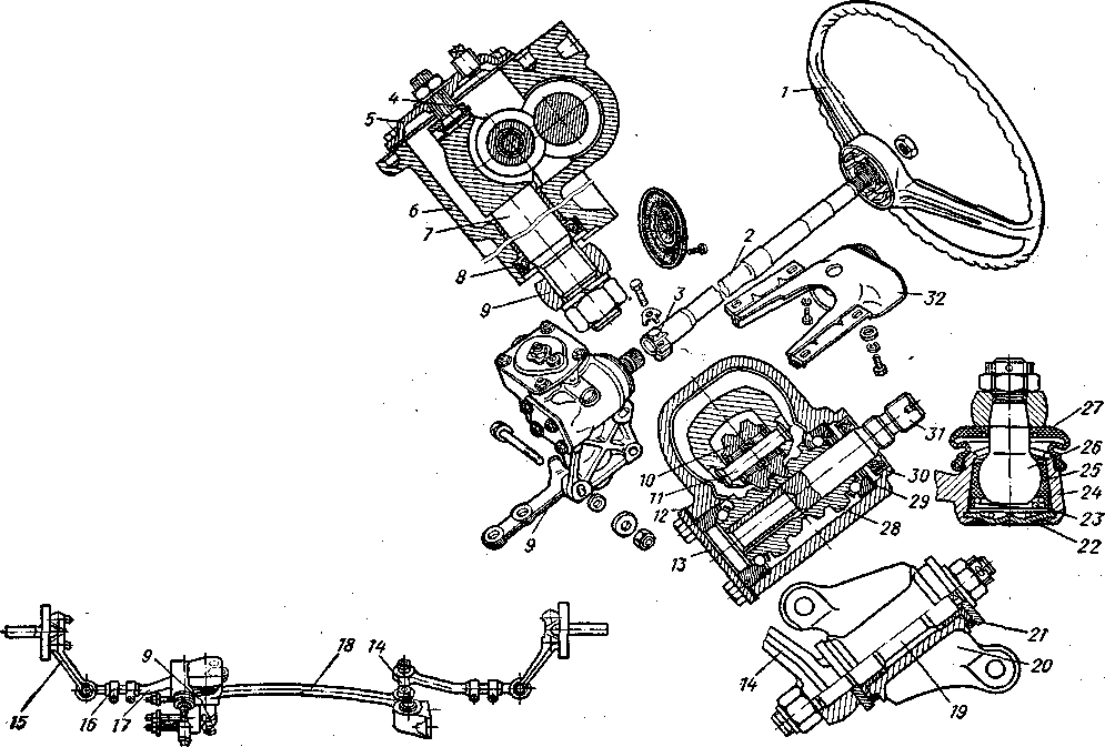Рулевой вал 3,4 установлен во втулке в резиновой обойме 33, закрепленной в кронштейне 32, который прикреплен к щитку кузова. На верхнем конце рулевого вала установлено рулевое колесо / с двумя спицами. В центре колеса расположена кнопка 2 включения звукового сигнала. Нижний конец рулевого вала соединен с валом 13 червяка на шлицах при помощи стяжного зажима 27. Такая конструкция составного рулевого вала с энергопоглощающим промежуточным зажимом устраняет передачу удара от картера на рулевой вал в случае аварии автомобиля. Энергия удара поглощается вследствие трения при скольжении вала червяка в зажиме 27, затягиваемом с определенным усилием при сборке.