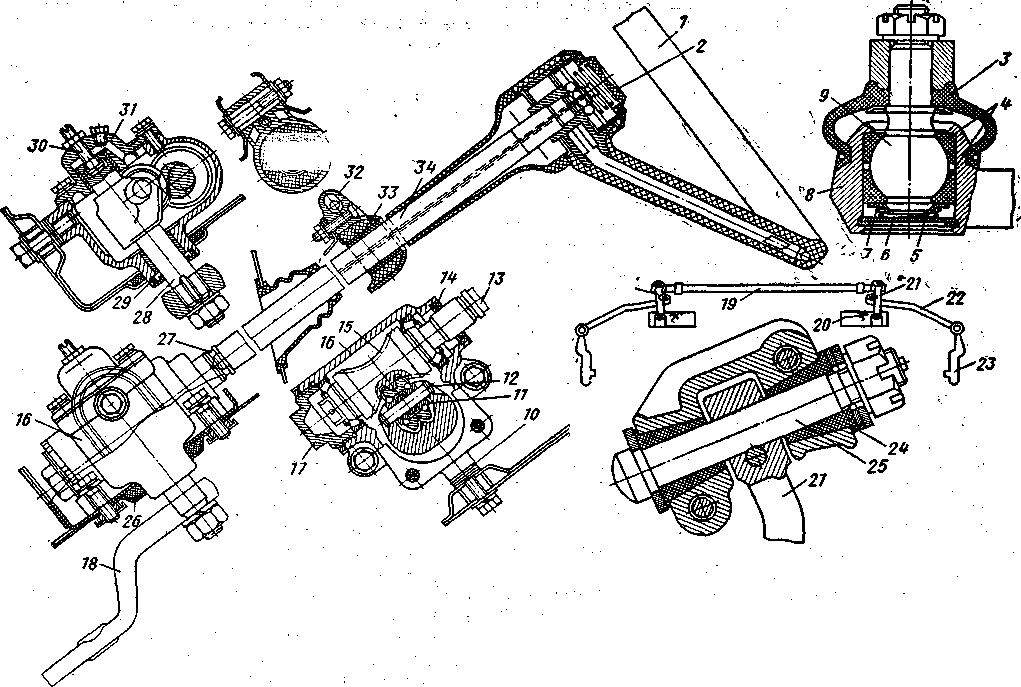 Соединения тяг с рычагами выполнено при помощи шаровых шарниров неразборного типа. Каждый шаровой шарнир представляет собой шаровой палец 26, закрепленный коническим хвостовиком при помощи шплинтуемой гайки в рычаге. Палец установлен в головке 24 тяги на конусном пластмассовом вкладыше 25 (полиуретан), обладающем высокими противо-износными свойствами. Вкладыш 25 поджимается к пальцу конической пружиной 23, опирающейся на заглушку 22, завальцованную в головке. Сверху головка закрыта резиновым грязезащитным чехлом 27 с металлической обоймой, напрессованной на выточку головки. Шаровые шарниры не нуждаются в смазке в процессе эксплуатации. Наибольший поворот управляемых колес ограничивается упором двух выступов, имеющихся на рулевой сошке 9, в головки нижних болтов, крепящих картер рулевого механизма.