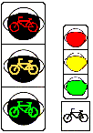 Для регулирования движения велосипедистов может использоваться также светофор с круглыми сигналами уменьшенного размера, дополненный прямоугольной табличкой белого цвета размером 200 х 200 мм с изображением велосипеда черного цвета.