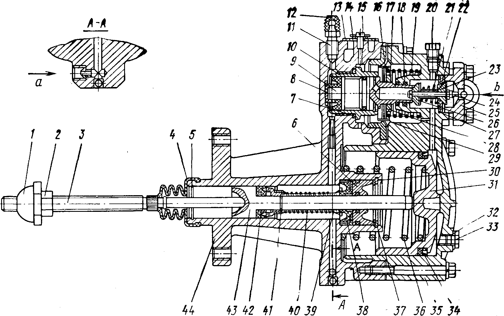 Нажимное устройство (см. рис. 1.2) состоит из двенадцати пружин. Пружины опираются на бобышки нажимного диска через шайбы из термоизоляционного материала. Суммарное усилие пружин равно 10500...12200Н (1050...1220 кгс).