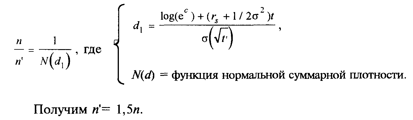 Пропорция опционов относительно акций (отношение п) зависит от нескольких параметров (курс ценной бумаги, оставшийся срок и т.д.), которые постоянно изменяются; следовательно, эту пропорцию надо постоянно приспосабливать, чтобы держать портфель без риска. В нашем случае инвестор не держит портфель без риска, потому что он не воссоздал свой портфель по воле колебаний параметра d>1>.