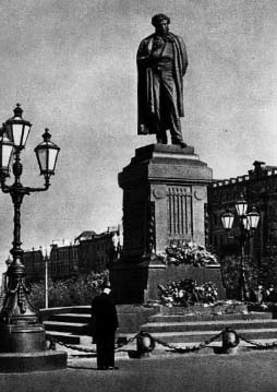 Напротив нас стоит памятник А. С. Пушкину. Поставлен он летом 1880 г. на деньги (84.000р.), собранные по подписке. Все просвещенное общество приняло участие в создании этого первого памятника поэту. Открывали его с небывалой торжественностью. Эти «пушкинские дни», первый праздник русской литературы, навсегда, как драгоценнейшее воспоминание, запечатлилось в сознании участников и очевидцев. В эти-то дни и были произнесены в торжественных заседаниях Общества Любителей Российской Словесности (в зале Благородного Собрания) замечательные речи Тургенева и Достоевского.