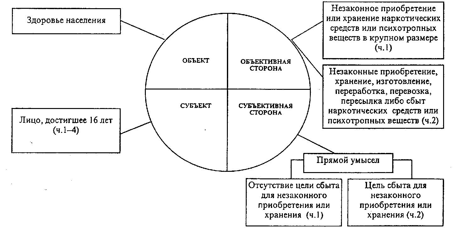 Объективная сторона образуется из двух видов действий: незаконное приобретение или хранение наркотических средств или психотропных веществ в крупном размере (ч.1) и незаконное приобретение, хранение, изготовление, переработка, перевозка, пересылка либо сбыт наркотических средств или психотропных веществ (ч.2).