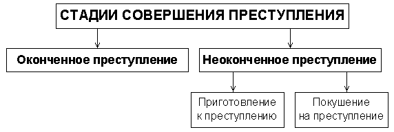 Закон различает оконченное и неоконченное преступления; последнее в свою очередь бывает либо приготовлением, либо покушением (ч. 2 ст. 29 УК) (Приложение 1). Таким образом, ст. 29 обозначает три стадии совершения преступления: оконченное преступление, приготовление к преступлению, покушение на преступление.
