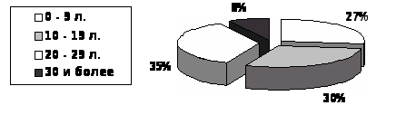 1. Время работы в данной организации. Большинство работников исследуемой организации работают в ней довольно продолжительное время. В сумме от 10 до 30 и более лет в данной организации работает 73% опрошенных. Менее 5 лет работают лишь 7 человек, то есть 19%.