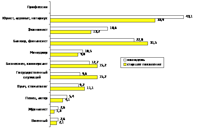 Наибольшим спросом у молодежи в 2002 году пользуются такие профессии, как экономист и бухгалтер (23%), менеджер (19%), юрист (13%), творческий работник (12%), программист (11%), предприниматель (10%). Ситуация в этом направлении не сильно изменилась по сравнению с летом 1998 году (см. приложение №1).