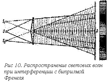 Затем можно поставить опыт по интерференции с бипризмой Френеля в белом свете. Обращается внимание на характер интерференционной картины: центральная полоса всегда белая; по обе стороны от неё – темные полосы; затем цветные полосы максимумов света, разделенные темными промежутками; последовательность расположения цветных полос – от фиолетового к красному, причем первая ближе к центральной белой полосе.