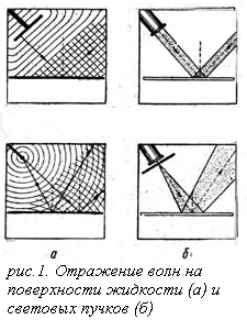 1.Используется аквариум с флюоресцирующей жидкостью. Параллельный пучок лучей от проекционного фонаря направляется на экран (металлическое или стеклянное зеркало), поставленный под углом к световому потоку. Последний отражается также под углом на поверхность воды в аквариуме. Преломленный пучок света ясно виден во флюоресцирующей жидкости. Отраженный пучок можно принять на белый экран или увидеть в задымленном воздухе.