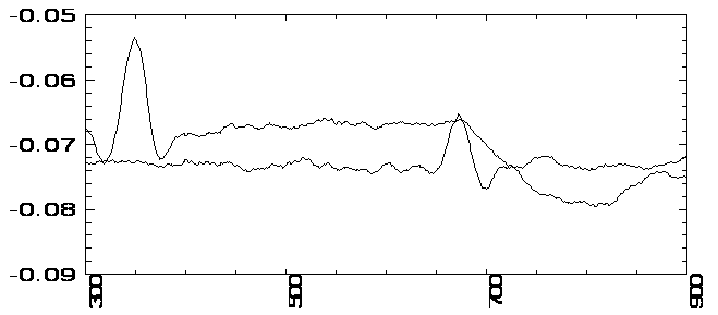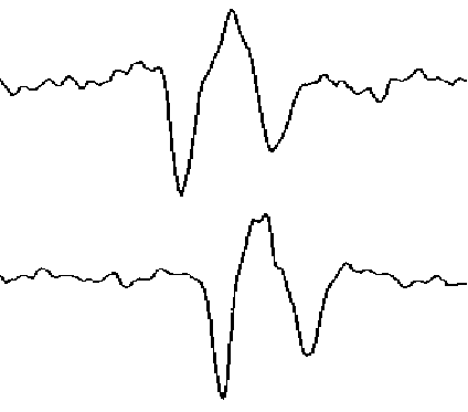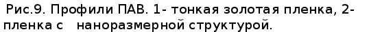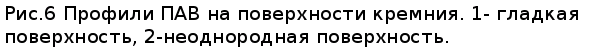 Так же проводились исследования ПАВ на поверхности стекла покрытого тонкой загрубленной серебряной пленкой толщиной примерно 50 нм., наблюдалось затухание волны, связанное с рассеянием на неоднородностях поверхности, профили импульсов 1 и 2 (рис.7) в данном случае получены для различных расстояний между точками возбуждения и регистрации (профиль 1 регистрировался на расстоянии 2 мм от точки возбуждения, профиль 2 на расстоянии 4 мм от точки возбуждения). Так же при распространении волны наблюдалось искажение ее профиля, что может быть связано с дифракцией волны на неоднородностях пленки и рассеянием в объемные волны.