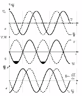 Таким образом, при движении акустической волны в местах сжатия повышается плотность положительного заряда, а в местах растяжения – плотность заряда уменьшается. Вследствие этого возникает периодическое распределение потенциала V вдоль цепочки с максимумами в областях сжатия. Изменение потенциала вдоль цепочки с максимумами в областях сжатия. Изменение потенциала вдоль цепочки для фиксированного момента времени оказано пунктирной кривой на рис. 6.17 б, а изменение потенциальной энергии W= –eV изображено сплошной линией.На