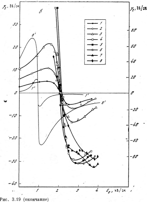 На рис. 3.18—3.21 приведены результаты измерений. а рис. 3.18 и 3.19 представлены кривые усиления рэлеевских (рис. 3.18, а, 3.19, а) и поперечных (рис. 3.18, б, 3.19, б) волн в образцах 1, 2 соответственно. По осям абсцисс отложена напряженность дрейфового поля в кристалле в киловольтах, по осям ординат — коэффициенты усиления (затухания) в дБ/см. Длина пути в кристалле, на которой происходило усиление рэлеевских волн, составляла 7мм, для поперечных волн эта длина равнялась 11.5 мм (образец 1) и 9,4 мм (образец 2). Каждая кривая на рисунках соответствует определенному значению электропроводности а кристалла. Области значений выбирались с таким расчетом, чтобы получить максимальные на данной частоте значения коэффициентов усиления волн в кристалле. На каждом из рисунков имеется по две теоретических кривых, соответствующих граничным (максимальному и минимальному) значениям электропроводности образца (рис. 3.20, а, 3.21, а — опыты с рэлеевскими волнами, рис. электропроводности для данного типа волн в данном образце. Эти кривые нанесены тонкими сплошными линиями (чтобы не увеличивать существенно размер рисунка, масштаб изменения отложен для них на правых осях ординат). На рис. 3.20 и 3.21 изображены кривые усиления шума в образцах 1 и 2 соответственно при различных значениях 3.20, б, 3.21, б — опыты с поперечными волнами). Под шумом здесь понимаются тепловые колебания решетки кристалла, усиленные дрейфовым полем (волны Дебая). Естественно, что шумы измерялись в полосе пропускания схемы (28—32 МГц).