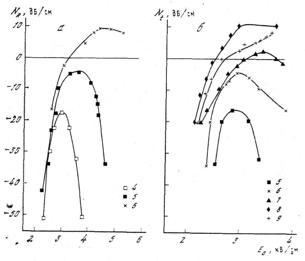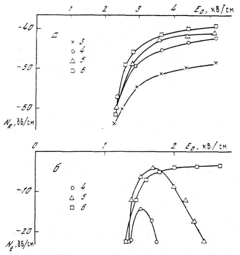 Рис. 3.21. Зависимость уровня шумового сигнала при усилении рэлеевских (a) и поперечных (б) волн от дрейфового поля в образце 2 (9--=3,5·10-5 Ом-1·См-1)