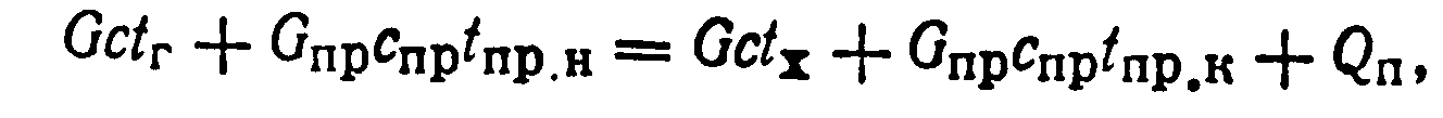 где Gпp — количество перерабатываемого в обогреваемом аппарате продукта, кг/ч; Спр—теплоемкость перерабатываемого продукта, кДж/(кг°С); tпр. и tap. K — начальная и конечная температуры перерабатываемого продукта, °С; Qп — потери тепла в окружающую среду, кДж/ч; остальные обозначения те же, что и в предыдущем равенстве.