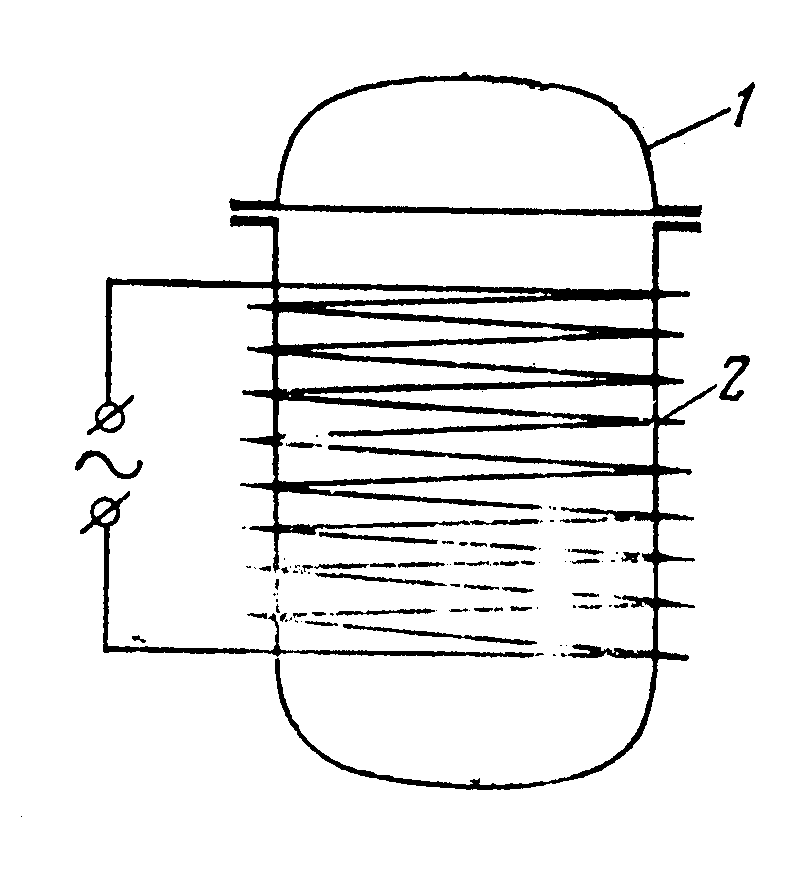 Электрические индукционные печи (рис. 7). Нагревание в этих печах осуществляется индукционными токами. Обогреваемый аппарат 1 является сердечником соленоида охватывающего аппарат. По соленоиду пропускают переменный ток, при этом вокруг соленоида возникает переменное магнитное поле, которое индуцирует в стенках обогреваемого аппарата электродвижущую силу. Под действием возникающего вторичного тока нагреваются стенки аппарата. Соленоид выполняется из медной или алюминиевой проволоки, имеющей малое осмическое сопротивление.