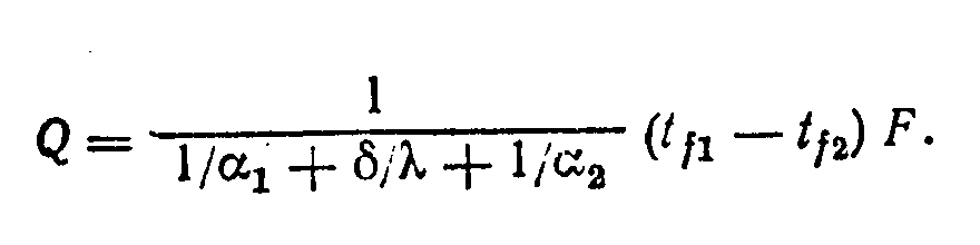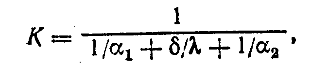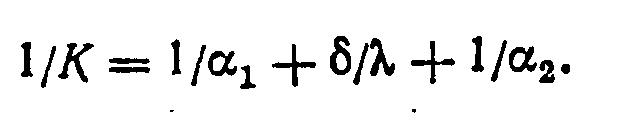 Величина 1/К, обратная коэффициенту теплопередачи, представляет собой термическое сопротивление теплопередаче. Величины l/>1> и 1/>2> являются термическими сопротивлениями теплоотдаче, а /—термическим сопротивлением стенки. Из уравнения следует, что термическое сопротивление теплопередаче равно сумме термических сопротивлений теплоотдаче и стенки.