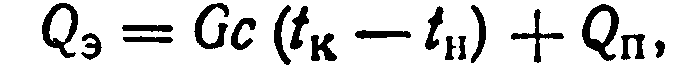 где Q>э>—количество тепла, выделяющегося в нагревательном электрическом устройстве при прохождении электрического тока, кДж/ч; G—-количество перерабатываемого в обогреваемом аппарате продукта, кг/ч; с—теплоемкость перерабатываемого продукта, кДж/(кг-°С); t>н> и tк—соответственно-начальная и конечная температура перерабатываемого продукта, °С; Qп— потери тепла в окружающую среду, кДж/ч.